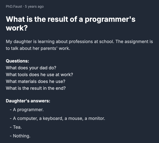 ☆ Yσɠƚԋσʂ ☆@lemmy.ml to Programmer Humor@lemmy.mlEnglish · 2 months agoWhat is the result of a programmer's work?lemmy.mlimagemessage-square0linkfedilinkarrow-up11arrow-down10cross-posted to: programmer_humor@programming.dev