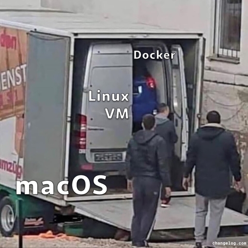 A photo of an opened semi-trailer unloading a cargo van, with the cargo van rear door open revealing an even smaller blue smart car inside, with each vehicle captioned as “macOS”, “Linux VM” and “Docker” respectively in decreasing font size. Onlookers in the foreground of the photo gawk as a worker opens each vehicle door, revealing a scene like that of russian dolls.