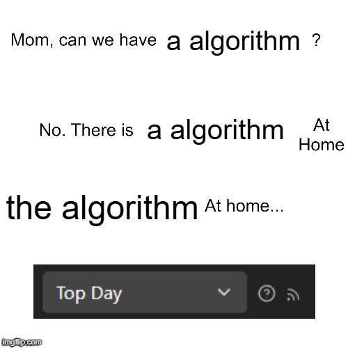 gerald_eliasweb@reddthat.com to memes@lemmy.worldEnglish · 5 days agoWe have a algorithim at homereddthat.comimagemessage-square1linkfedilinkarrow-up19arrow-down10