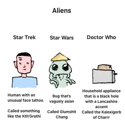 minus-squareAnna@lemmy.mllinkfedilinkarrow-up4·1 day agoYeah sometimes I think doctor who writers are on some alien drugs.