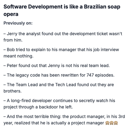 arrow-up172arrow-down1imageSoftware Development is like a Brazilian soap operalemmy.ml☆ Yσɠƚԋσʂ ☆@lemmy.ml to Programmer Humor@lemmy.mlEnglish · 6 days agomessage-square3linkfedilink