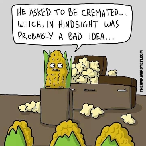 Funny meme aside, it wouldn’t actually work because cremation is way too hot to pop corn. At around 1000 Celsius, the corn would instantly carbonise and turn to ash, just like the rest your body.