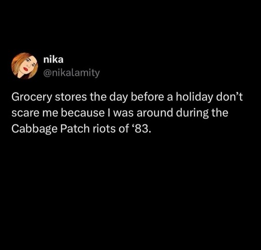 minus-squareXella@lemmy.worldlinkfedilinkarrow-up8·2 days agoI like to go grocery shopping at Walmart on Black Friday. I’m not fazed. I was there in the trenches with my aunt for Tickle me Elmo and Beanie Babies. I was born and bred for this.