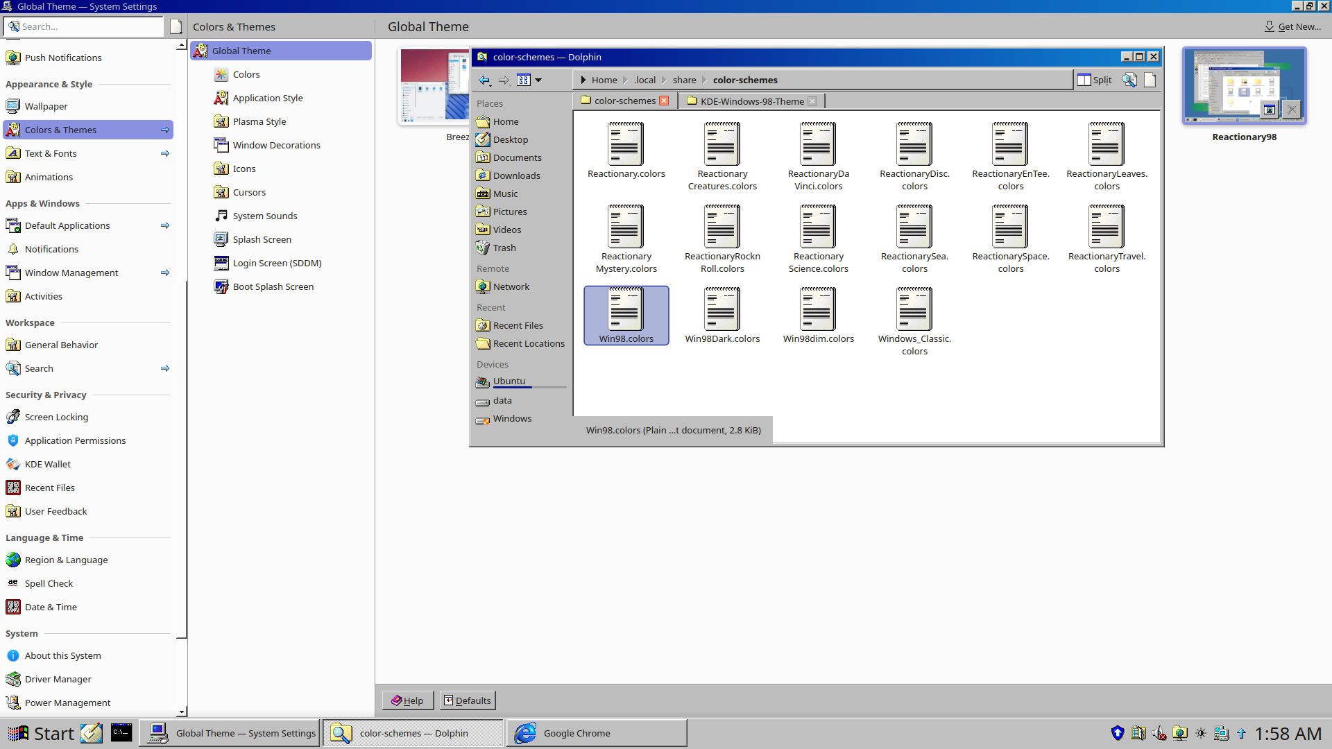 To install this, open System Settings, go to Colors & Themes -> Global Theme. In the top right there’s a button for “Get New…”, wait for it to load (it’s very slow) then search for reactionary, and wait again, then install Reactionary 98.