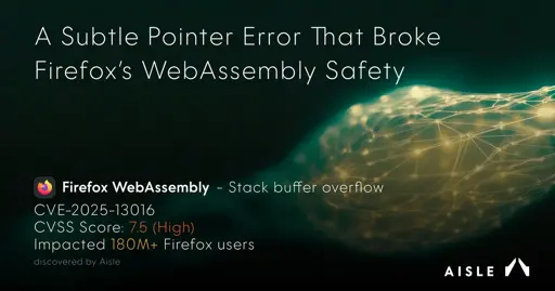 AISLE discovered a stack buffer overflow in Firefox’s WebAssembly engine that evaded detection for six months despite shipping with its own regression test. The vulnerability, CVE-2025-13016, enabled arbitrary code execution through a single line of incorrect pointer arithmetic, affecting over 180 million Firefox users worldwide.