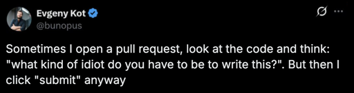 minus-squareunaligned_cat@piefed.calinkfedilinkEnglisharrow-up1·12 days agoThen it becomes your mess when you need to touch that piece of code
