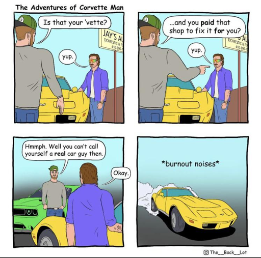 Let’s see… both males portrayed suck… who cares about corvettes anyway. And then he burns rubber…