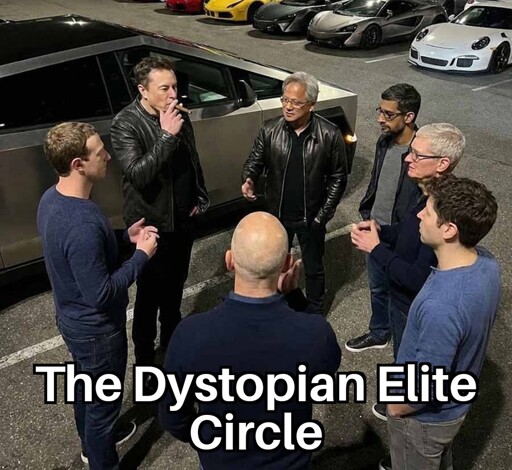 What really throws me are their poses. They’re all in poses that you typically see them in from public sources. Elon smoking a cigar was probably part of the prompt, unless I’m unaware of something. Tim Apple even doing the classic stage pose.