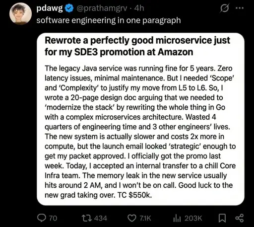 Did this guy actually oversee a fully transition to a new service and waste a bunch of internal time and money for a system that’s sub-optimal by any conceivable measure? Idk, maybe. If he’d just written “Twitter” instead of “Amazon”, I’d have taken it at face value no problem.