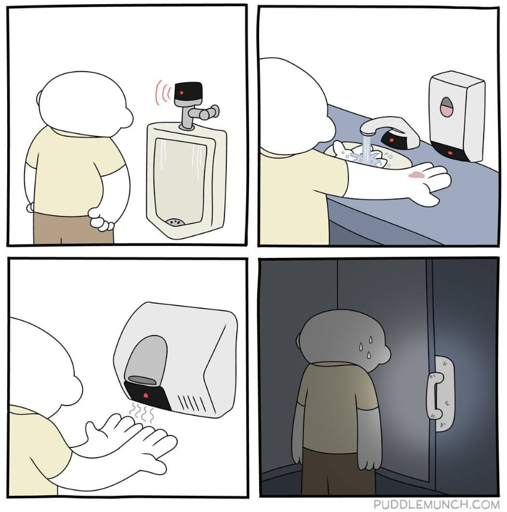 I hate those stupid air dryers. Most of them barely do any better than just shaking your hands in the air, because they’re simply spraying your clean hands with all of the shit and piss particles that are floating in the air.