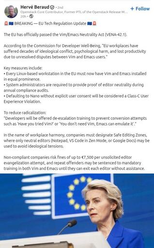 minus-squareGobbel2000@programming.devlinkfedilinkarrow-up1·27 days agoAll offices within the EU administration will be supplied with the officially modified flavors of eumacs and neuvim.