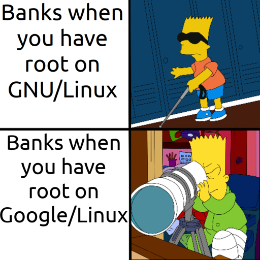 Waffelson@lemmy.world to linuxmemes@lemmy.world · 2 years agoWhy don't banks like root on Android?lemmy.worldimagemessage-square5linkfedilinkarrow-up11arrow-down10